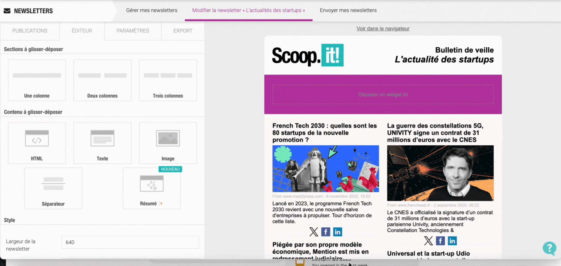 Lors de la création de vos newsletters, grâce au widget Résumé ✨, vous pouvez: